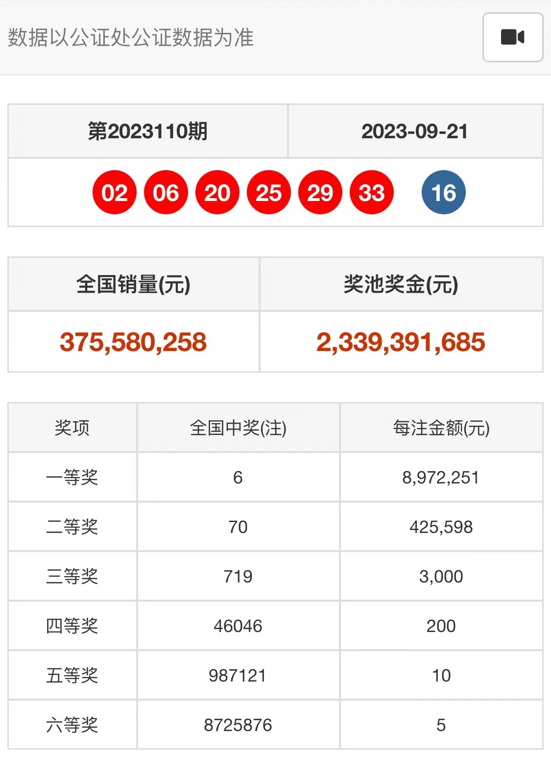 9月21日晚,福彩双色球2023110期开奖,开奖号码为33 25 6 20 29 2 16。象山一彩友以一张8元“6+4”复式票同时击中1注一等奖和3注二等奖,总揽获奖金10249045元(税前)。这已是宁波今年来中出的第九个双色球一等奖,也是今年第二个千万级超级大奖。