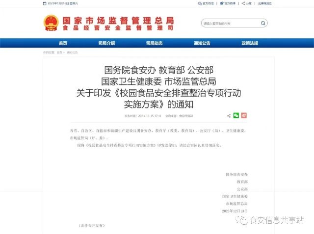 ▲ 国务院食安办等五部门联合部署校园食品安全排查整治专项行动,要求清退一批不合格承包经营企业。