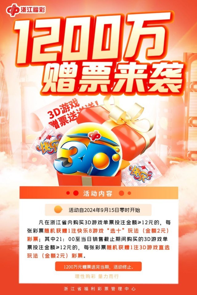 活动期间,凡在浙江省内购买3D游戏单票投注金额≥12元的,每张彩票随机获赠1注快乐8游戏“选十”玩法(金额2元)彩票;其中21:00至当日销售截止期间购买的3D游戏单票投注金额≥12元的,每张彩票随机获赠1注3D游戏直选玩法(金额2元)彩票。