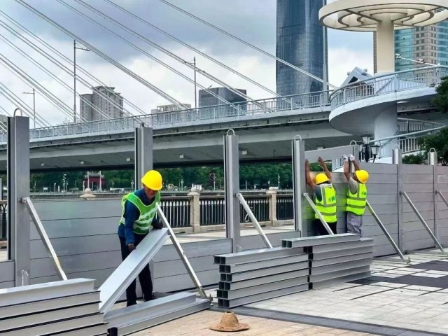 江北区老外滩步行街区工作人员正加班加点全力施工,安装保丰闸到常洪隧道的铝合金挡板防洪墙,保障12小时内全线防洪挡板安装至4.13米高程。