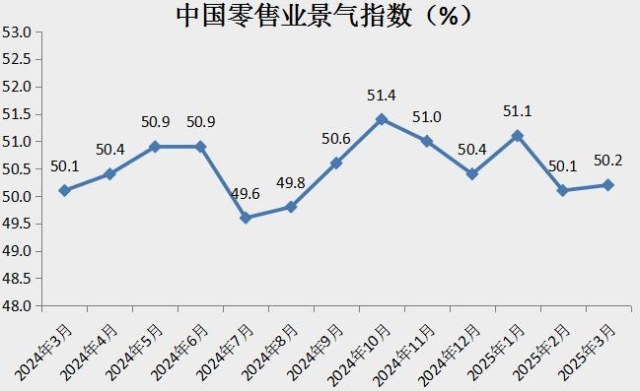 ▲ 3月份中国零售业景气指数为50.2%,消费市场活力稳步提升。