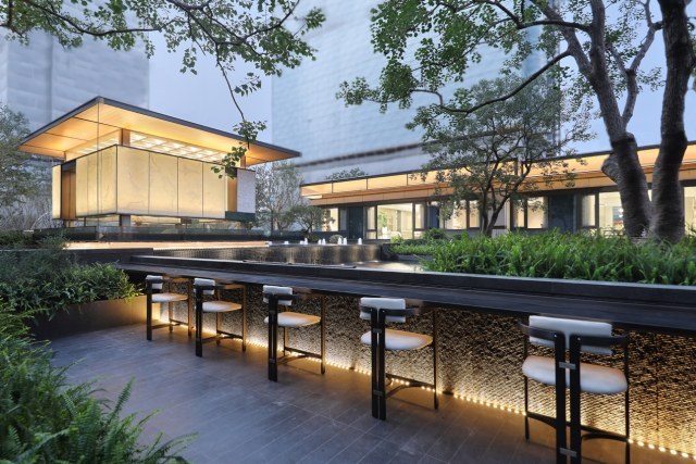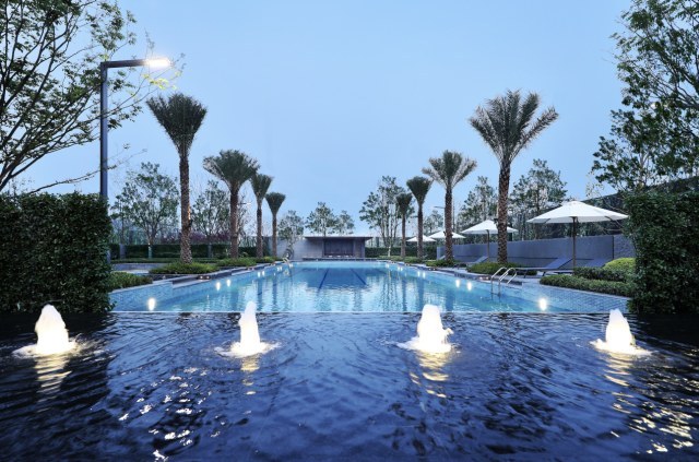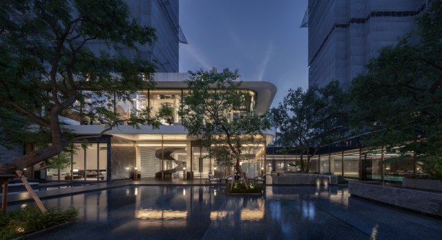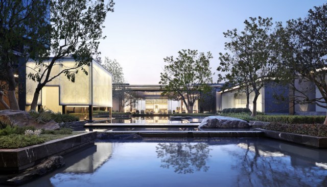 媒体团首站踏入明州瑧悦,飞檐立面在阳光下勾勒出东方韵律,与园内理山叠水、移步易景的五重园林相映成趣。 从入口“翰林墨池”的墨韵,到游廊“蟒水锦纹”的精致,每一处景观小品皆显匠心。度假式双泳池、全龄架空层交织,处处彰显保利发展对品质人居的卓越追求。
