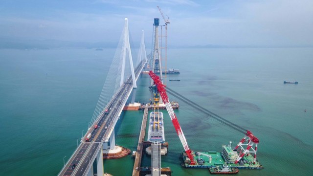 ▲ 国内市域铁路最大重量节段钢混结合梁成功架设,长约107.5米,重达1720吨。