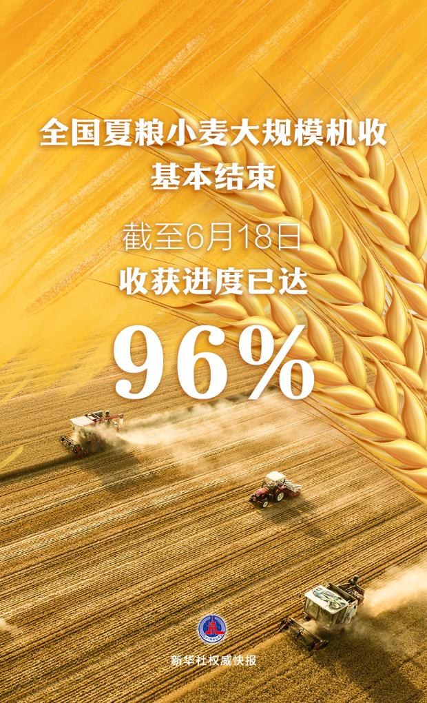 ▲ 全国“三夏”小麦大规模机收基本结束,收获进度已达96%。