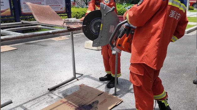 第二个实验模拟了使用切割机进行切割时产生火星的危害。当火星落到木屑上时,木屑表面虽然没有明显火焰,但内部也已经开始阴燃,这种"隐形火种"往往更加危险,而且更容易被忽视。