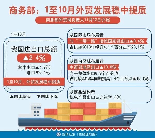 ▼1至10月份,我国进出口总额同比增长2.4%,外贸发展稳中提质。