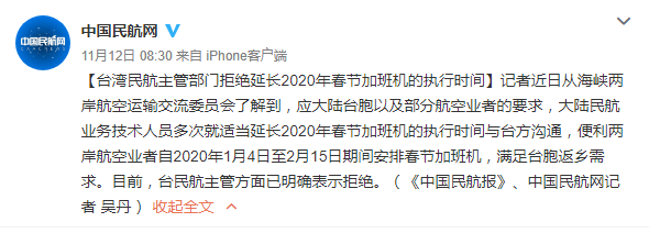 ▼台湾民航主管部门拒绝延长2020年春节加班机执行时间。