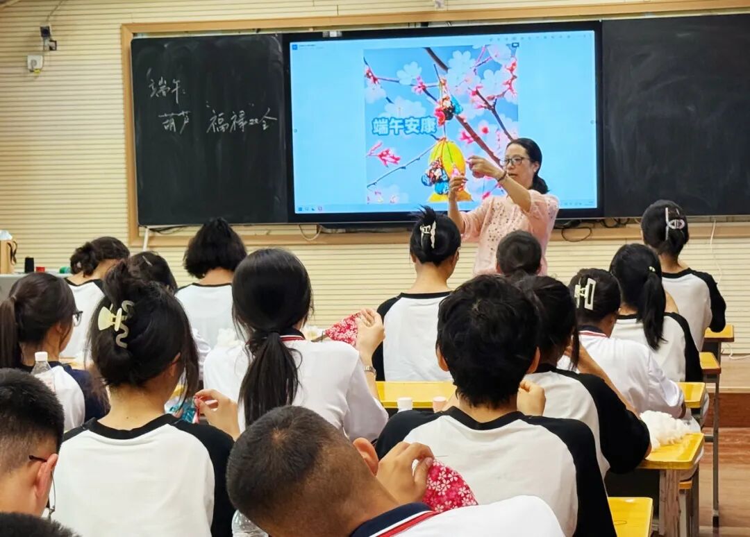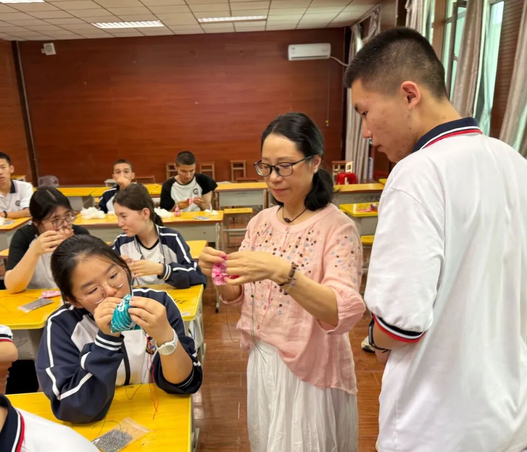 随后,沈海红从讲台下拿出薰衣草、彩线、布料等材料,说道:“今天,我们要亲手制作一份特别的礼物——结合新疆薰衣草的葫芦香囊。”在沈老师的指导下,学生们动手制作,将薰衣草装入葫芦形香囊中,再缝上五彩丝线。沈海红老师解释:“葫芦香囊寓意纳祥保平安,体现了中原文化与多民族文化的融合,以及现代文化与古代文化的包容与创新。”