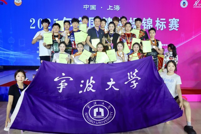 宁波大学健美操队在此次赛事中成为万众瞩目的焦点,表现尤为抢眼。他们一路过关斩将,共斩获 3 项冠军、1 项亚军和 1 项季军,成绩斐然。其中,在成年健将组女子单人操项目中,宁波大学选手以精准的动作、灵动的身姿和出色的艺术表现力,征服了现场裁判与观众,成功摘得桂冠;成年健将组混合双人操项目中,选手们配合默契,动作流畅,最终获得亚军;成年精英组五人操项目,队员们凭借新颖的编排和整齐划一的动作,展现出强大的团队实力,将冠军收入囊中;成年组有氧舞蹈项目,他们用充满活力的舞姿和饱满的热情,再次站上最高领奖台。此外,宁波大学还获得了成年组团体总分季军。