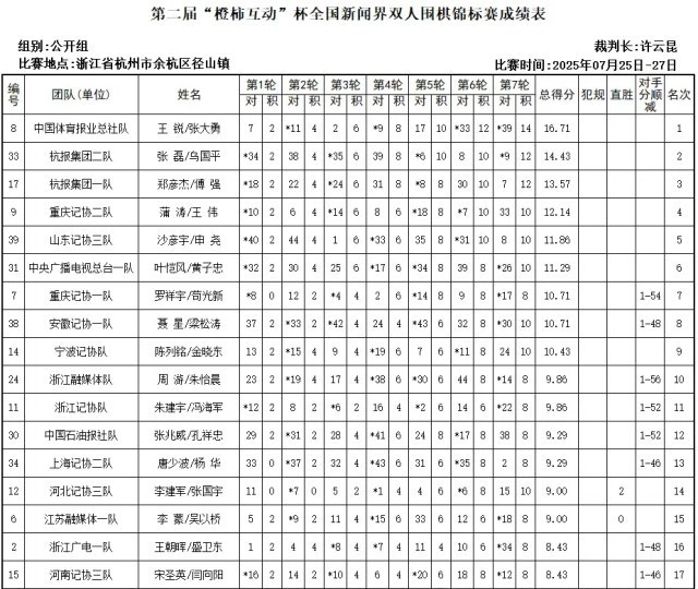 最终,中国体育报业总社队、杭报集团二队、杭报集团一队分获前三名。值得一提的是,宁波陈列铭/金晓东组合名列第九。(通讯员李虹刚)