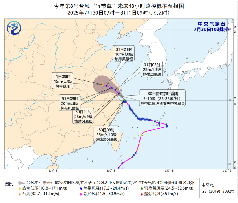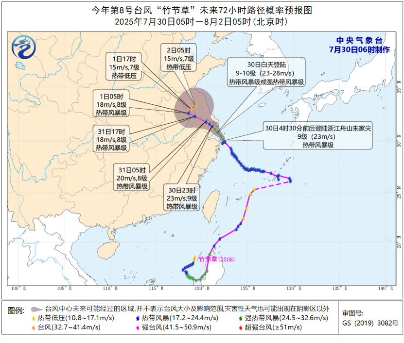 大风预报:7月30日14时至31日14时,黄海中南部、东海大部、台湾海峡北部、山东半岛南部沿海、江苏沿海、上海沿海、长江口区、杭州湾、浙江沿海、福建沿海将有6-8级、阵风9-10级的大风,“竹节草”中心经过的附近海域或地区风力可达9-10级、阵风11-12级,另外,江苏东南部、浙江东北部、上海等地将有5-7级、阵风8-9级的大风。