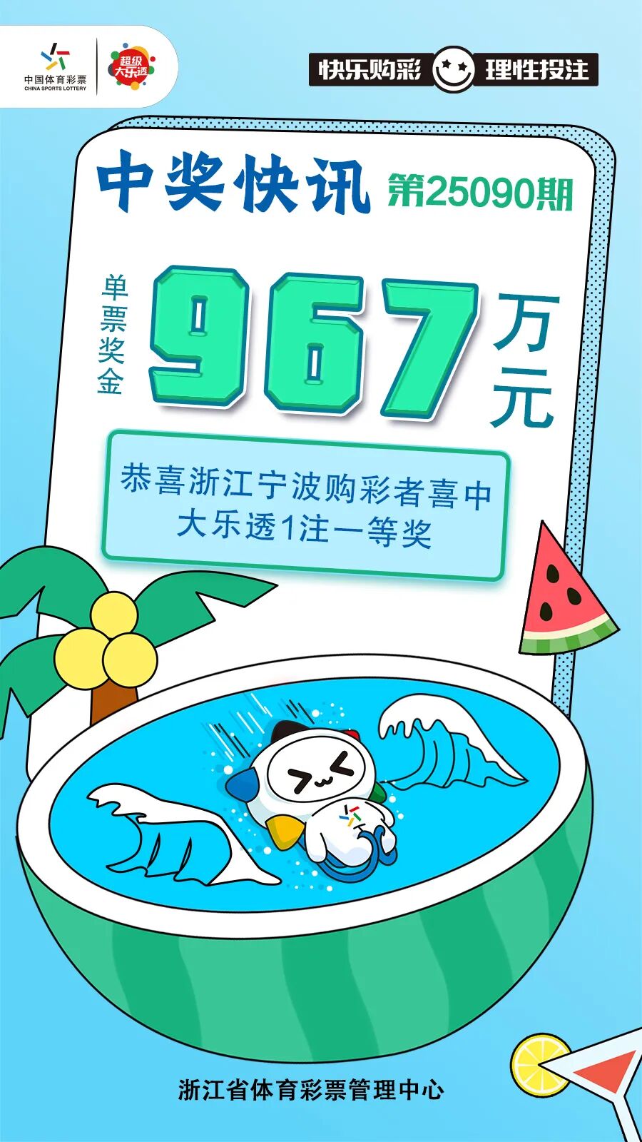 8月9日,体彩大乐透第25090期开奖,当期全国中出7注一等奖,单注奖金964万元,其中1注追加投注,追加奖金771万元。本期宁波中出1注一等奖,单票奖金967万元,没有追加投注,错失追加奖金。