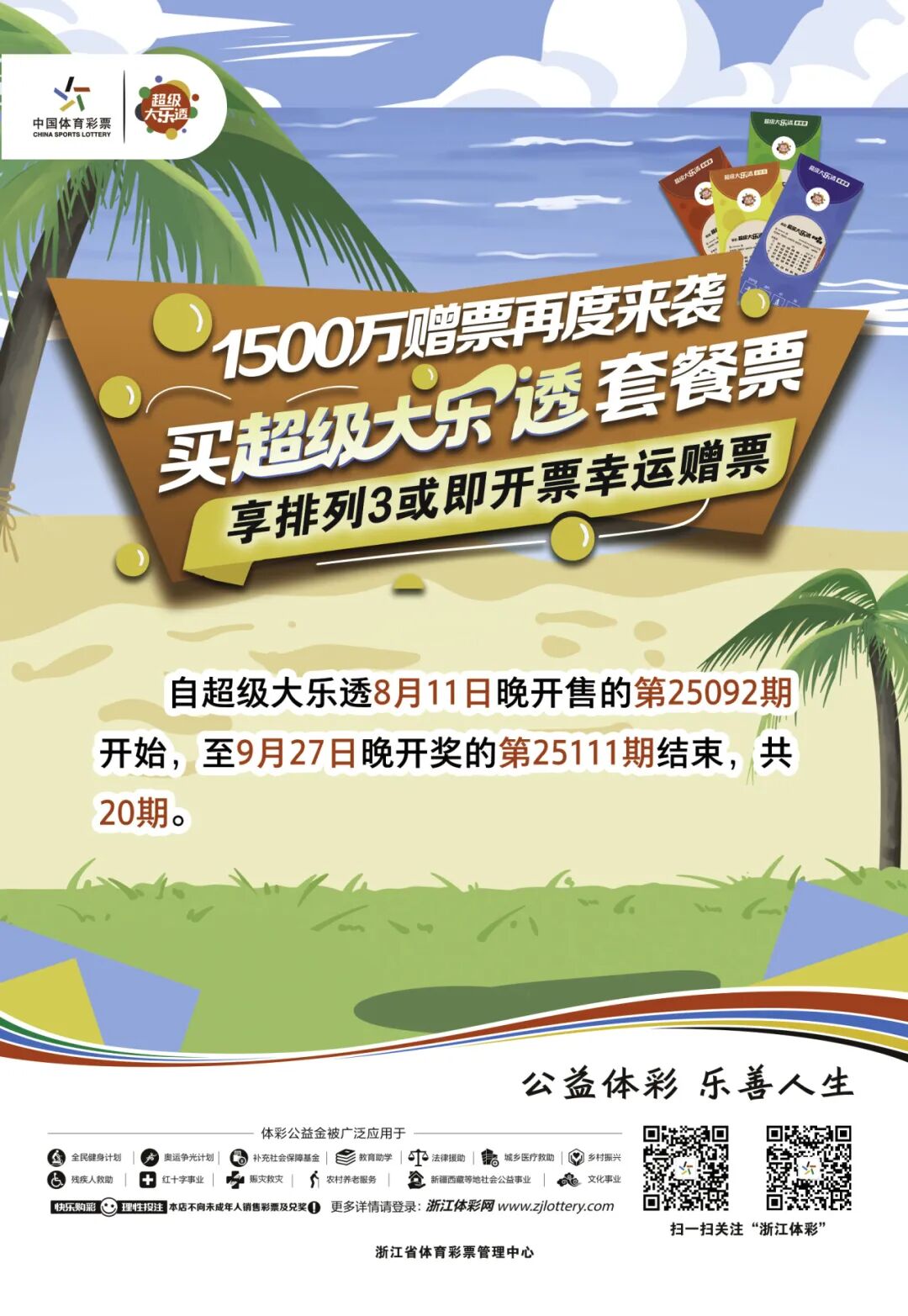 这个夏天,浙江体彩大乐透套餐票活动已正式开启!活动期间只要您走进浙江省内任何一家体彩实体店选择购买超级大乐透套餐票,即有机会获得“排列3”或即开票赠票。一份投入,不同精彩体验,让大乐透的期待叠加赠票的惊喜,在这个盛夏点燃您的好运火花!