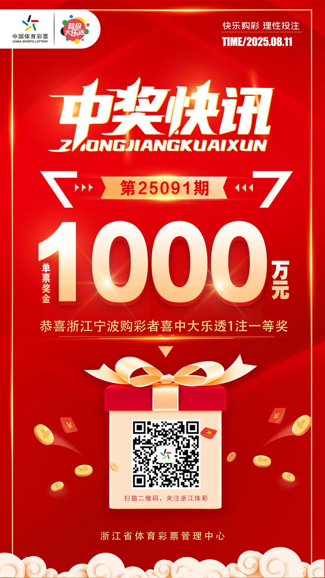 8月11日,体彩大乐透第25091期开奖,当期全国中出2注一等奖,单注奖金1000万元。本期宁波中出1注一等奖,单票奖金1000万元,没有追加投注,错失追加奖金。值得一提的是,在体彩大乐透25090期我省宁波地区也中出了1注一等奖,连续两期中出大奖,宁波可谓是鸿运当头!