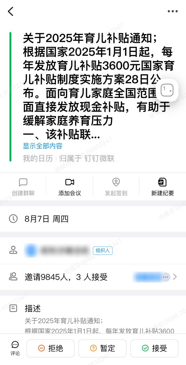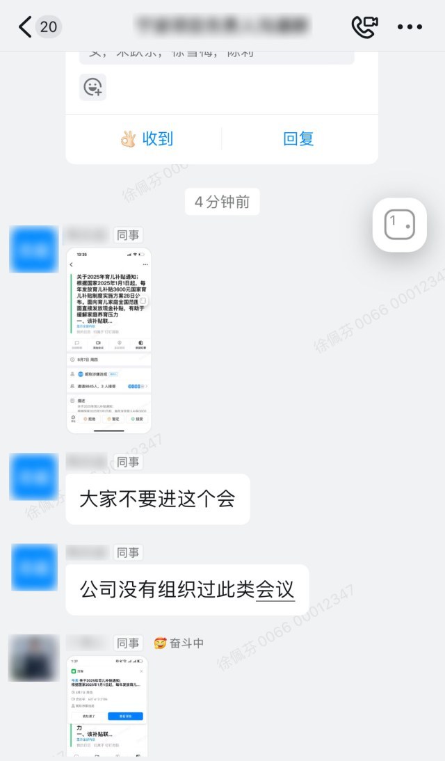 近日,一条诱人的消息在南部商务区一楼宇的物业群中炸开——“进入会议,速领2025育儿补贴!”几乎同时,公司内众多员工的钉钉账号都收到了一封《关于2025年育儿补贴通知》的会议邀请。到底是真是假,请听记者报道。