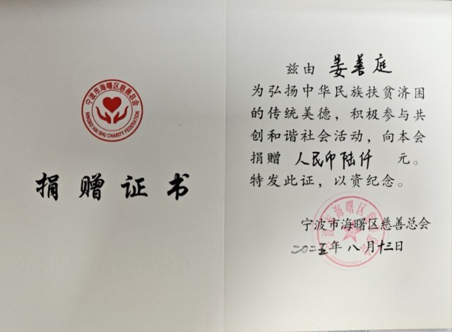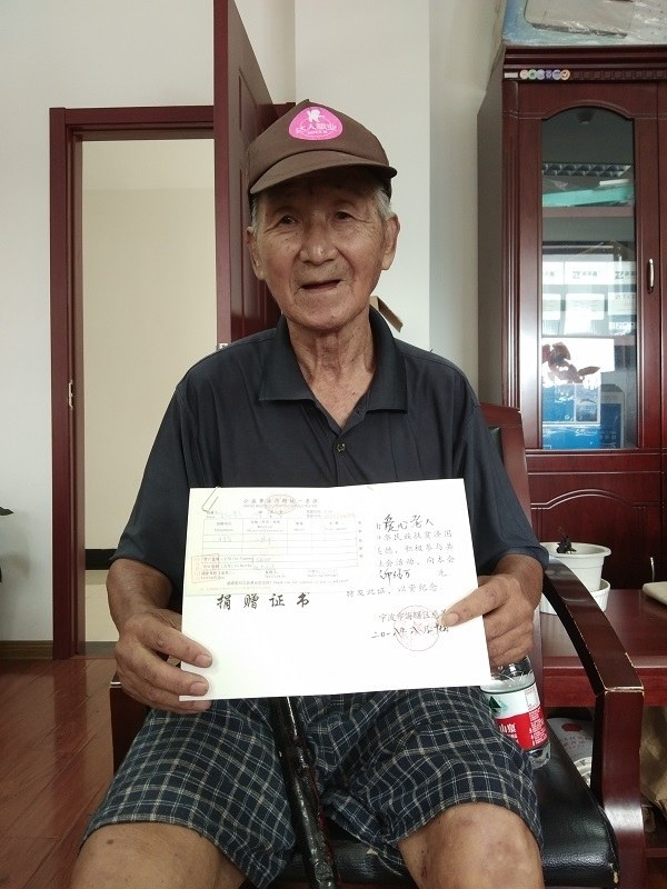 2018年,老人将5万元积蓄捐至海曙区慈善总会时,在捐赠证书上仅留下“爱心老人”四字;2019年,他拄着拐杖到派出所委托民警代捐1万元......