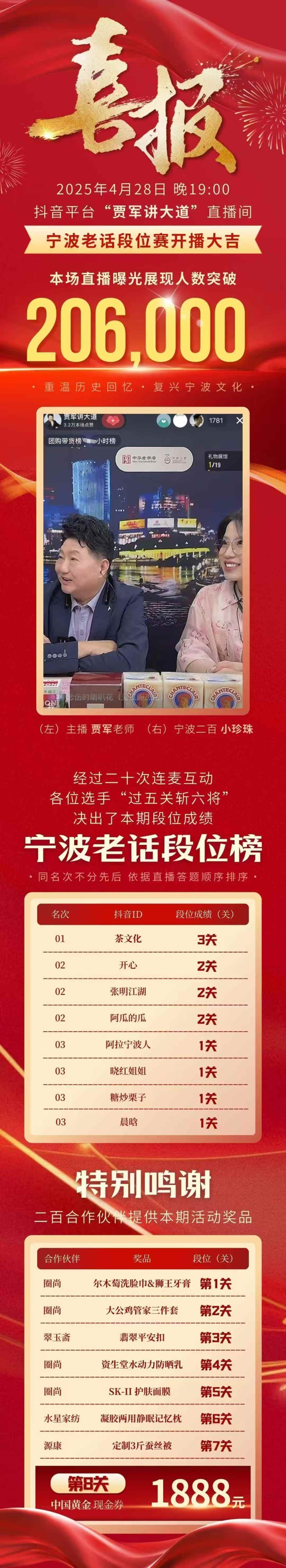 2025年年初开始与抖音中的“本地生活”板块进行深度合作,开始每月一定次数的直播,品类包含1-6楼所有的品类(黄金珠宝,床上用品,男女服装,箱包鞋类等等)。从4月28日开始,每月8号、28号与贾军老师合作,一起在二百8楼直播间给大家带来宁波老话线上比赛;从7月份开始,每月18号,在商店开展非遗沉浸式演绎空间线下表演,并全程在抖音现场直播。全新打造的五楼透明直播室也将于不久与大家见面!