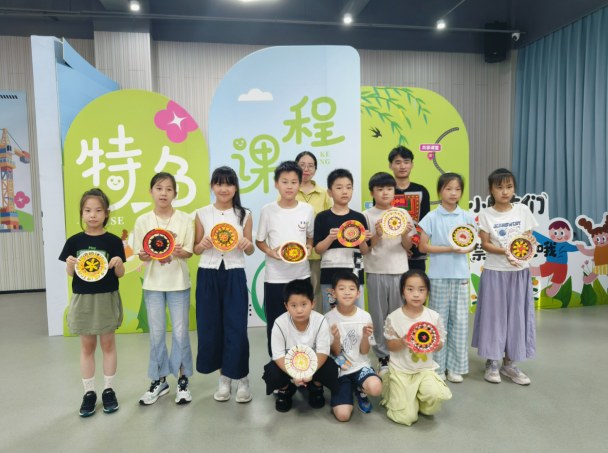 “有这么好的民族手艺,我们就想着是不是可以把这个活动延续下去,让优秀的职工来给我们工会暑托班的孩子们上一个非遗课。”社区工会的想法迅速落地,“稚趣·非遗学堂”应运而生。暑假班的每周二,社区活动室就成了孩子们的“非遗小天地”。他们体验了蜡染扎染、泥塑捏捏乐、旗袍盘扣,见识了宋锦、苗银还有彝族髹饰,六次课,六种不同的非遗体验,让孩子们在玩的过程中,不知不觉摸到了传统文化的门道。