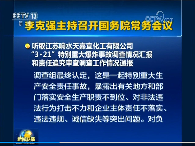 ▼李克强主持召开国务院常务会议,听取江苏响水爆炸事故调查情况汇报,部署安全生产专项整治。
