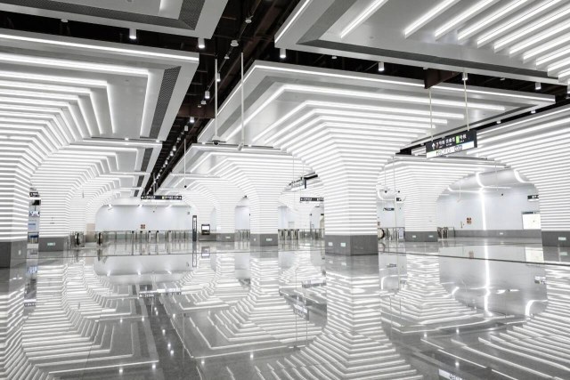 另一个特色站小洋江站以"星河五洲"为主题,将"桥拱"造型与水、浪等元素相融,又彰显出赛博朋克的风格,而且他还是宁波轨道首个“三线换乘”站。宁波轨道交通建设分公司现场业主代表肖永生。