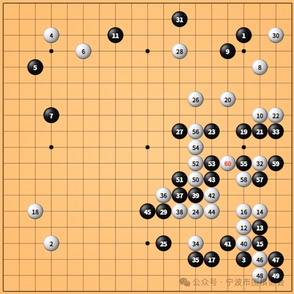 主将台焦点战中,“肆拾玖坊”队宫玉杰执白对阵曾获镇海区“雄镇弈道杯”棋王、奉化区“棋王赛”冠军的陈巍。陈巍执黑开局后一度占据主动,以断棋、飞棋等招法将白棋数子包围,局势看似占优。面对困境,宫玉杰行棋稳重且暗藏巧思,通过制造头绪、埋伏断点等手段寻求生机,逐步扭转局面。至白 60 手,宫玉杰形成“两点见合 的关键优势,或吃黑棋筋、或就地反杀,彻底掌握主动权。最终战至 98 手,陈巍无心恋战投子认负,宫玉杰中盘获胜。