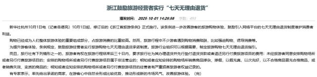 ▲ 修订后的《浙江省旅游条例》10月1日起正式施行,鼓励旅游经营者实行“七天无理由退货”。