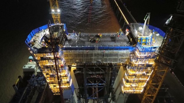▲ 杭州湾跨海铁路桥南航道桥建设取得新进展,顺利完成首个下横梁浇筑。