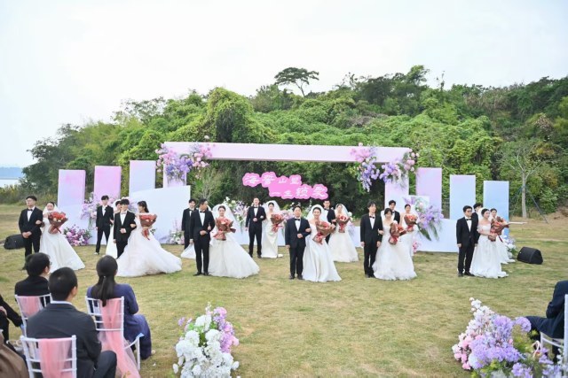 伴随着悠扬的弦乐,12对新人手挽手走过缀满鲜花的T台,海风轻拂白纱,浪花应和誓言,新人共执刻有姓名的铜锁许下“锁定此生”的诺言,全场宾客齐诵誓言卡传递祝福,新人代表宣读《婚事简办倡议书》,分享“极简婚礼”经验,12只系着心愿卡的气球腾空而起,现场爆发出热烈掌声。“在美丽的天妃湖完成人生大事,比在酒店里办酒席更有意义,这份记忆终身难忘。”新人陆鹏程与王于楠感慨。