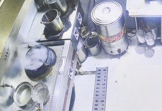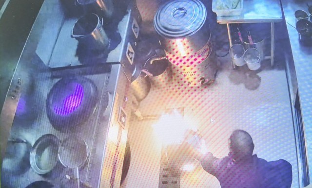 锅盖盖不住,灭火器灭不了?店内厨师葛师傅回忆自己第一时间采取的措施还是有点想不明白,当时他正在备菜,转头发现油锅冒出浓密白烟。他试图移开油锅,但就在移动的瞬间,“蹭”一下燃起明火,葛师傅立即将锅放至地面,先后尝试用锅盖覆盖、湿抹布扑压,却无法完全隔绝火焰。