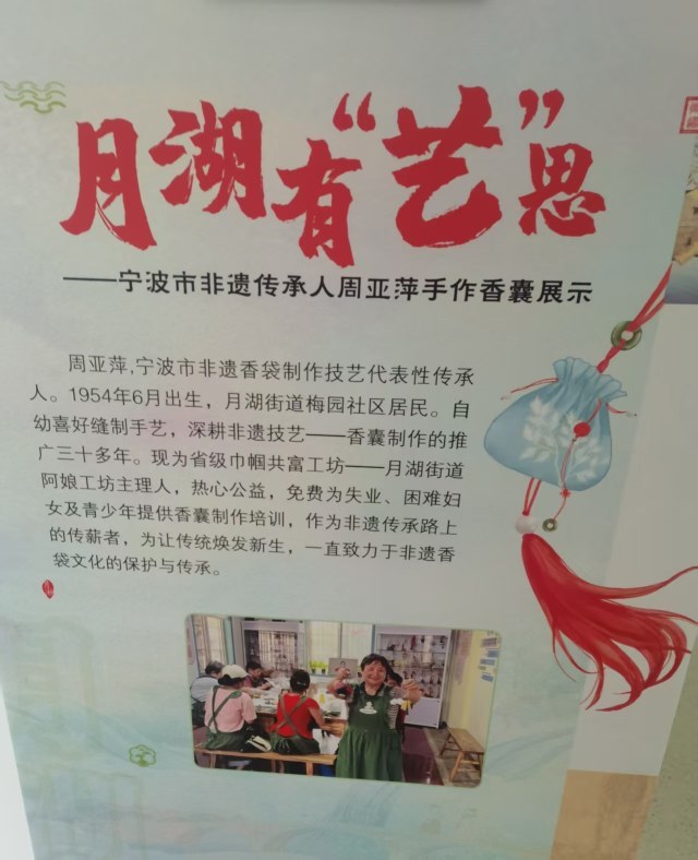 一囊一袋寄托美好祝愿,一针一线蕴涵无限柔情。香袋,就像一种文化符号,成为海曙区一项民间文化特色。如今,海曙区月湖街道梅园社区专门成立了“舞指工坊”,以周亚萍核心,已发展老中青16名成员,专注香袋制作技艺的宣传推广。“舞指工坊”每年都会依据不同生肖制作香袋,在街道和社区的非遗基地进行展示。同时,以月湖街道文化站为阵地,开设香袋制作系列公益课,举办特色香袋展览活动,展示传统手工技艺的魅力。作为海曙区图书馆“真人图书”宣讲平台志愿者,周亚萍经常受邀在“真人图书”宣讲平台、企事业单位、学校等地,传授香袋制作技艺,让更多的人共享多彩非遗。