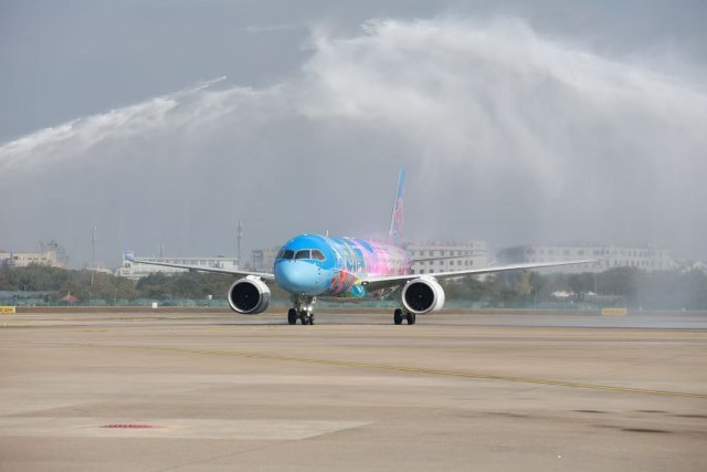 11月18日10时24分,搭载着162名旅客的CZ3777航班平稳降落宁波栎社国际机场。这架身有十五运会彩绘飞机“大美湾区”号,注册号为B-658W的C919国产大飞机,缓缓滑行通过象征民航界最高礼遇的“水门”,今后宁波人在“家门口”就能亲身感受我国航空工业的最新成果。