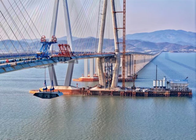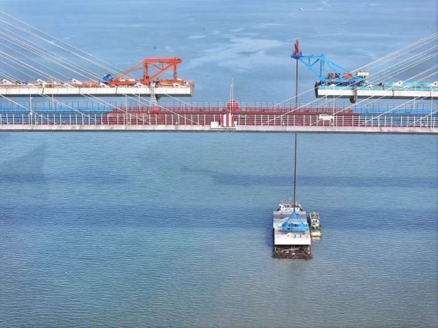 市域铁路象山港跨海大桥主桥钢箱梁历经近8个月的架设后,12月16日,主桥倒数第4片钢箱梁按期稳步起吊,冲刺大桥合龙的最后36米。