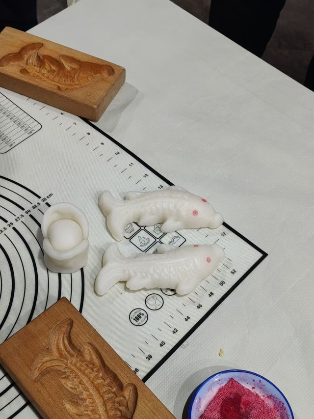 互动体验:参与者可轮流使用木杵捣年糕、用模具压制成“年糕鱼”等形状,并亲手点红点、写福字,感受制作乐趣。