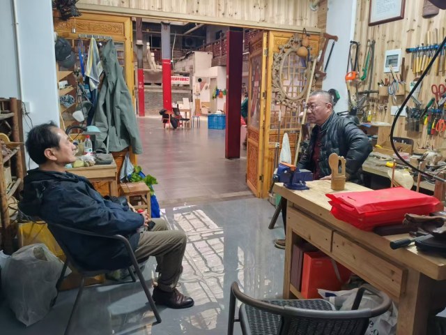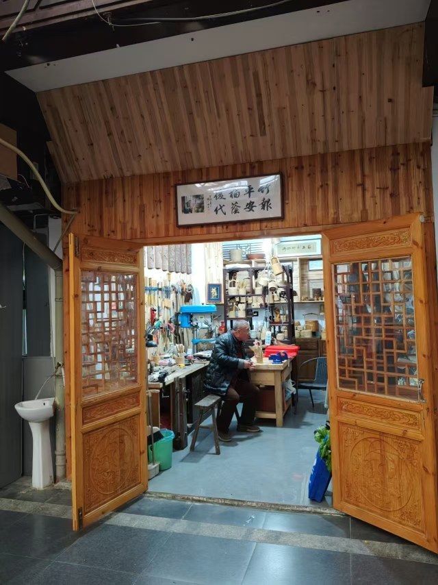 退休后,印敏敏在鼓楼沿步行街开设了一家"印象竹刻馆"。2022年,他受邀作为"非遗使者",带着妻子来到山下庄村。