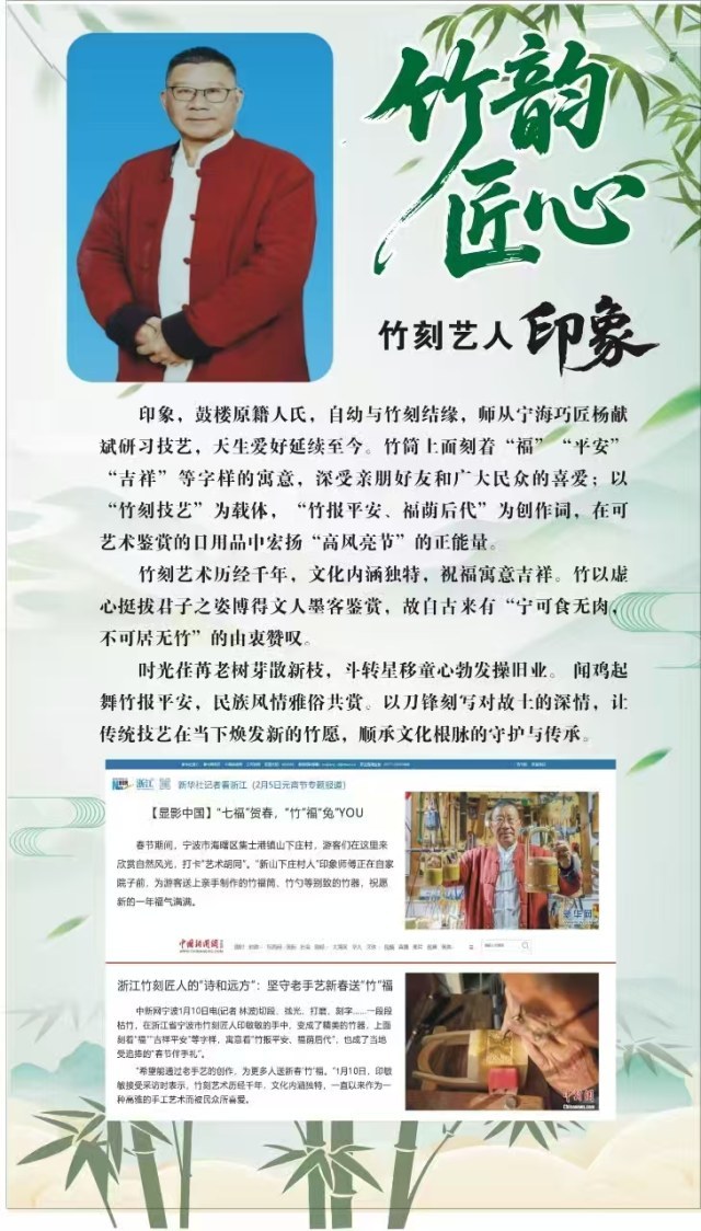 "一方面我想尽量多做些作品,作为随手礼送客人;另一方面,我要通过作品宣传底蕴深厚的宁波地域文化,留住乡愁。"印敏敏感慨,如今鲜有愿意学习竹刻技艺的年轻人,他更要凭一己之力,以乡村为平台,不遗余力地弘扬竹文化,让乡村成为更多人的"诗与远方"。