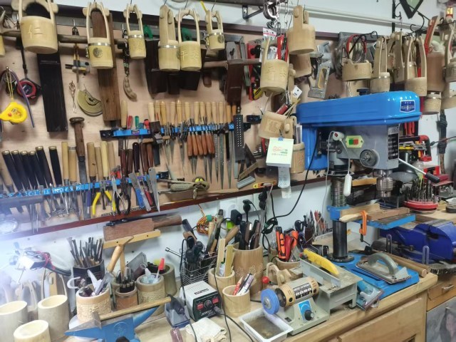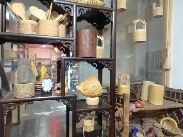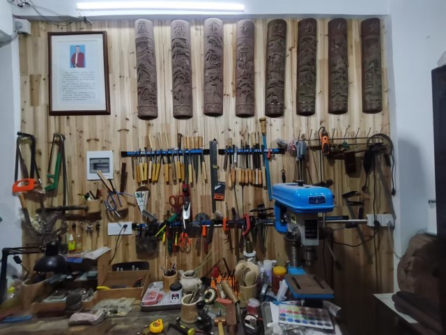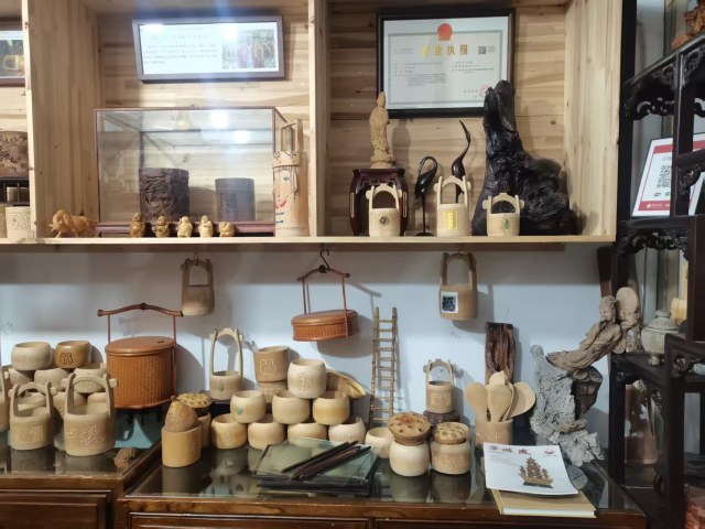 工作台,台面上摆放着竹制工艺品:竹笔桶、竹勺……墙上则密密麻麻地挂满了各种工具。再往屋里看,地上放置着很多竹原料,桌子、墙上展示着各类竹工艺品。