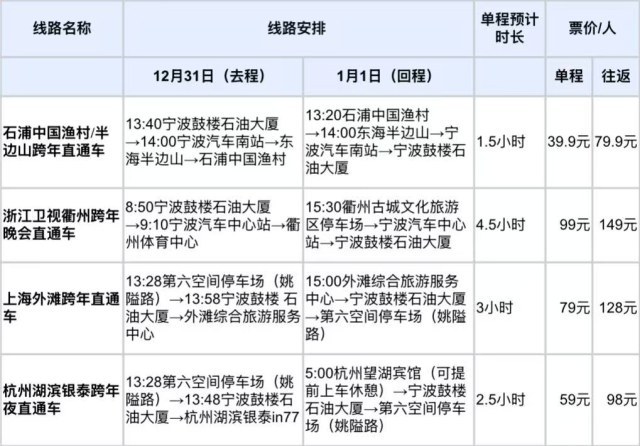记者了解到,此次开通的跨年直通车串联象山东海半边山、石浦中国渔村、浙江卫视衢州跨年晚会现场、上海外滩及杭州湖滨银泰等热门目的地。线路均明确往返班次安排,12月31日出发、1月1日安排返程,站点选址为鼓楼石油大厦、汽车南站等交通便利处。
