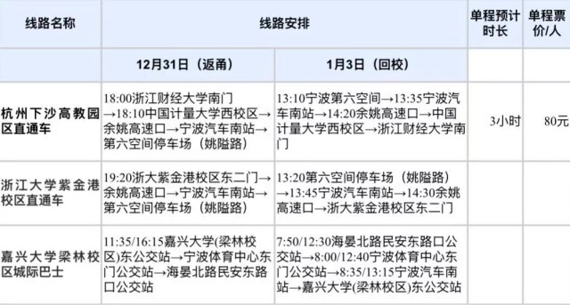 针对学子出行痛点,校园直通车重点覆盖杭州、嘉兴高校片区。杭州方向开通下沙高教园区及浙江大学紫金港校区专线,12月31日安排返甬班次、1月3日设置回校班次,单程预计3小时,票价80元/人,串联高校与宁波核心站点;嘉兴大学梁林校区城际巴士则设置多时段班次,双向衔接高校与宁波体育中心、海晏北路等站点,适配学子灵活出行。值得一提的是,杭州方向可通过“宁波公运”微信服务号“校园直通车”板块查询详情,嘉兴方向则可通过“浙客行”微信小程序了解信息。
