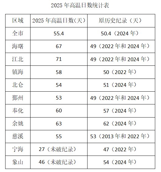 2025年夏季宁波高温强度强、持续时间长,刷新多项历史纪录。全市平均高温日数55.4天,较常年(23.1天)偏多32.3天,打破历史纪录(原纪录50.4天,2024年),最晚高温日出现在10月13日,打破历史最晚纪录(原纪录10月3日,2022年)。