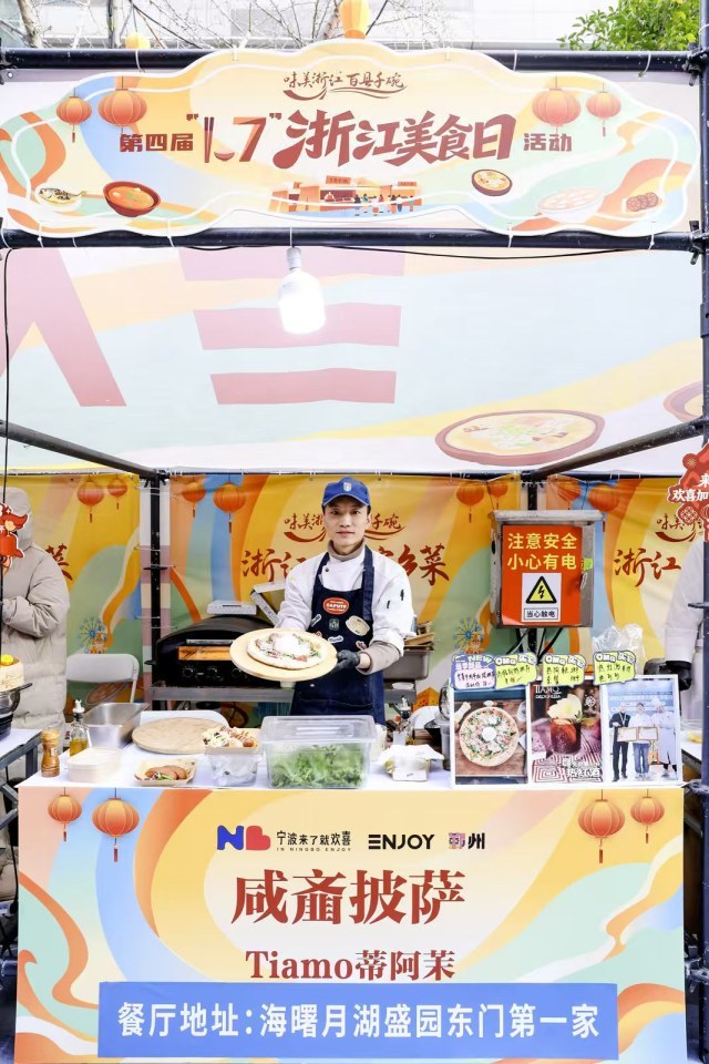 更令人称奇的是,传统与现代在此碰撞出创新的火花。本地知名餐吧Tiamo蒂阿茉将宁波“下饭神器”鄞州咸齑与意大利披萨结合,首创推出“咸齑披萨”,这种大胆的融合风味吸引了大量好奇的食客尝鲜。从“踩”出来的鄞州老味道,到“烤”出来的潮流新吃法,宁波美食的传承与创新活力在此展现得淋漓尽致,也让鄞州非遗文化以更鲜活的形式走进大众视野。