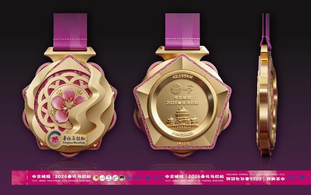 赛事服装选用亮眼的玫红色系,呼应桃花主题,由知名品牌“果凡”匠心打造。采用东丽高品质面料,结合高弹拼接与双倍透气结构,兼顾贴合感与运动自由度,助力跑者保持干爽舒适。奖牌设计同样精彩,正面以奉化桃花为灵感,粉金渐变花瓣充满动感,边缘融入奉化地标轮廓,凸显城市印记。特别的是,奖牌内置可旋转桃花装置,转动间呈现不同画面,寓意每一步奔跑皆见风景,趣味十足。