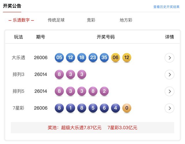 中国体育彩票超级大乐透 第26006期开奖公告