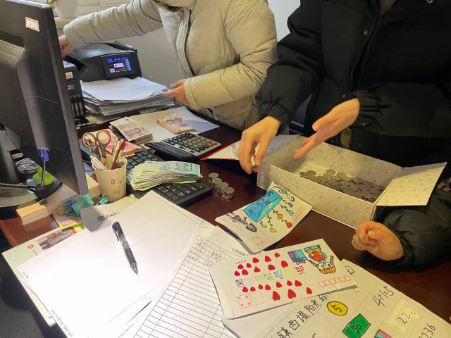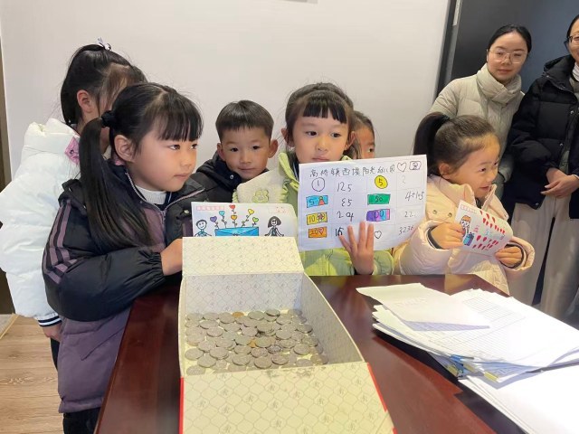 “这里有3297元。”另一位孩子将手绘版捐赠统计图递到工作人员手中。图表上,孩子们用绘画的方式,清晰地记录着捐赠数据:1元硬币125枚、5毛硬币2枚、50元纸币5张、100元纸币22张等。