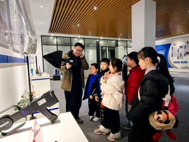 “小朋友们,你们知道怎么在不发射信号的情况下监测低空目标吗?”在公司展厅,浙江波誓盾科技有限公司董事长丁学科以趣味提问开篇,拉开了科普讲解的序幕。从无源雷达探测系统的“隐蔽式监测”原理,到无人机管控平台“频谱感知+光电追踪+反制处置”的一体化技术,再到多模定位设备如何填补复杂环境定位空白,专业人员用通俗易懂的语言将深奥的科技知识转化为生动故事,孩子们听得目不转睛,不时举手提出自己的疑问。