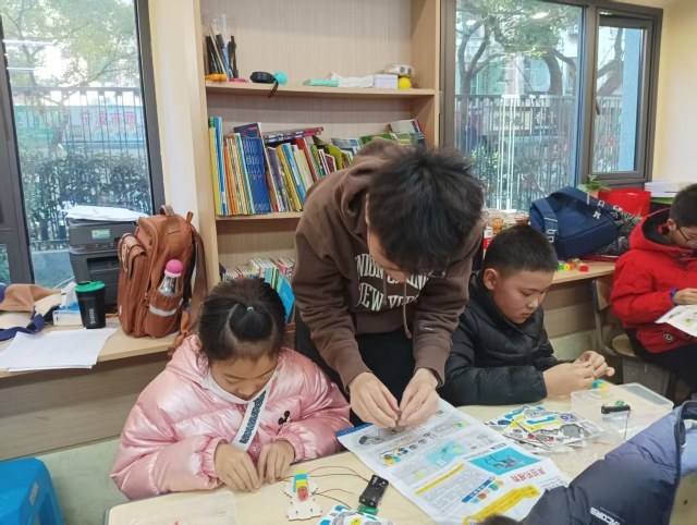 “看!我的‘小狗’会打招呼了!”马园社区小南童学活动室里传来阵阵欢声笑语。这个寒假,社区专门为辖区青少年打造的“人工智能探索营”火热进行,一群孩子正围坐在桌前,兴奋地组装、操控着自己专属的机器狗模型。