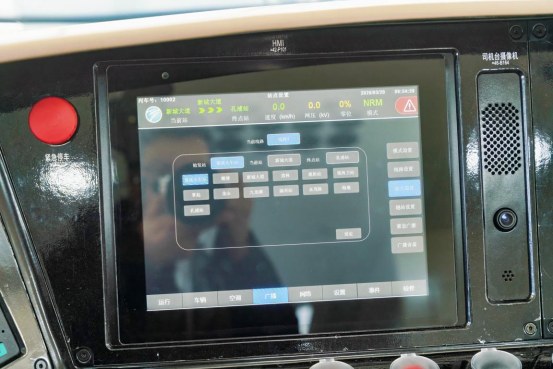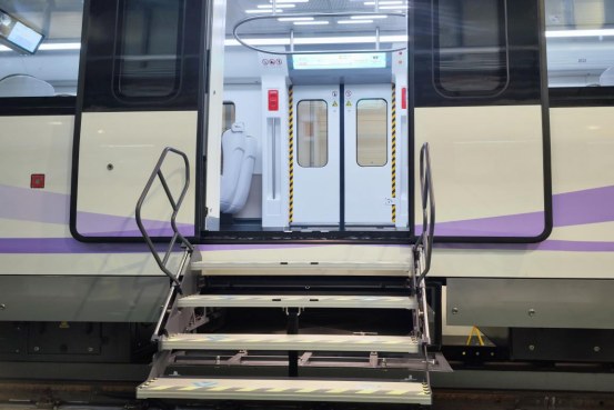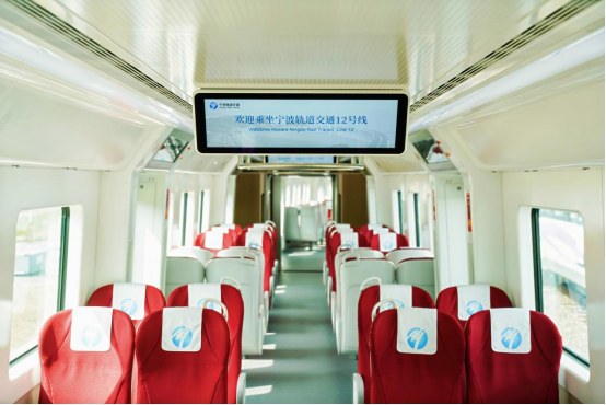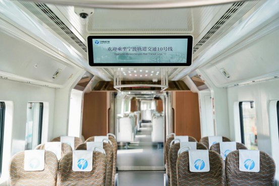 与既有线路列车内装不同,车厢内采用了全新的布局设计,一排排横向的织物座椅整齐排列,部分座位配有小桌板,营造出更加舒适、自在的乘车空间。更宽更大的动态地图显示屏和多媒体显示屏,让站点、线路等信息更加醒目。车厢门区取消立柱扶手,为后续市域线“轨道+物流”预留更多空间。列车双向首节车厢还配备了侧向紧急疏散装置,有效提升高架段紧急疏散效率。