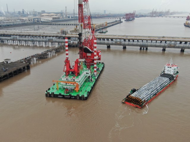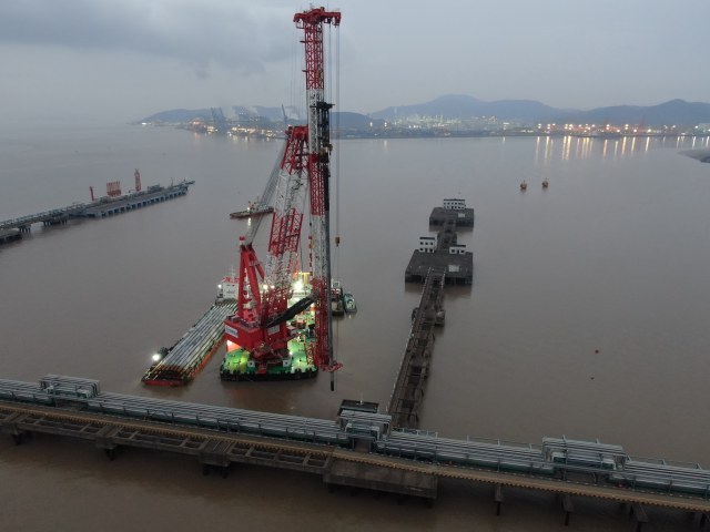 宁波舟山港信润码头的建设现场,这个总投资1.2亿元的项目,作业正有序开展,项目负责人徐晓峰站在连接桥上,看着忙碌的船机:“这条船是国内第一条就拥有完全知识产权的,就是国内设计、国内制造的,所以这个是我们的项目的重点特色。如果没有这条打桩的,我们这边桩没法打。”
