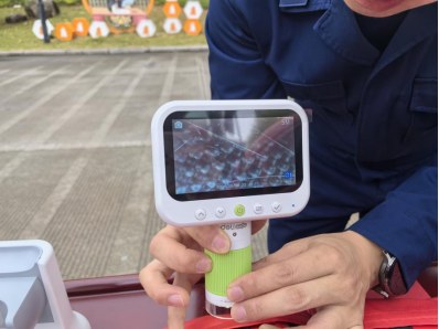 第一项实验聚焦材质安全:消防员使用猪皮模拟人体皮肤,在玻璃纤维灭火毯表面反复摩擦。结果显示,猪皮表面明显刺入细小纤维,肉眼可见“扎手”现象。随后,消防员通过显微镜放大观察,清晰看到玻璃纤维的针状结构。“此前有媒体报道,一名儿童在使用灭火毯时手掌被扎满玻璃纤维,刺痛难忍。”消防员提醒。