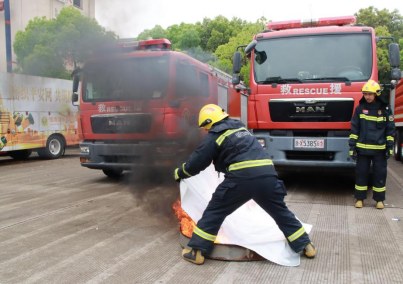 第三项实验演示灭火毯正确使用方法。消防员在油桶内点燃柴油,模拟厨房油锅起火场景。手持灭火毯,轻轻覆盖在油桶上,随后迅速平整边缘确保与桶壁贴合、隔绝空气。约2分钟后慢慢移开,火势完全熄灭。消防员一边操作一边讲解:“灭火毯要从靠近身体一侧向外铺盖,动作轻柔避免掀起火焰;覆盖后切勿立即掀开,防止复燃。”