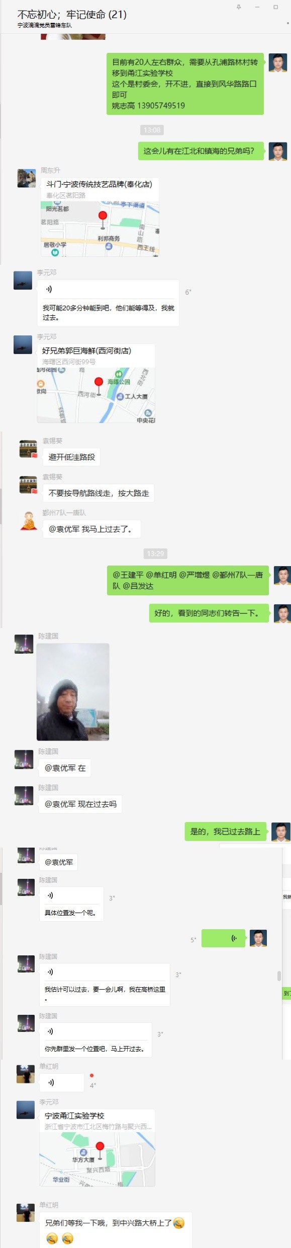 7月26日上午,江北团区委再发出通知,有780余名群众需要转移,起始点为甬江实验学校的安置点,到孔浦路林村。消息发出后,李元邓和小伙伴们再次及时响应,共有30多位司机参与了转移工作,其中一位司机从60公里之外赶来参与救援。